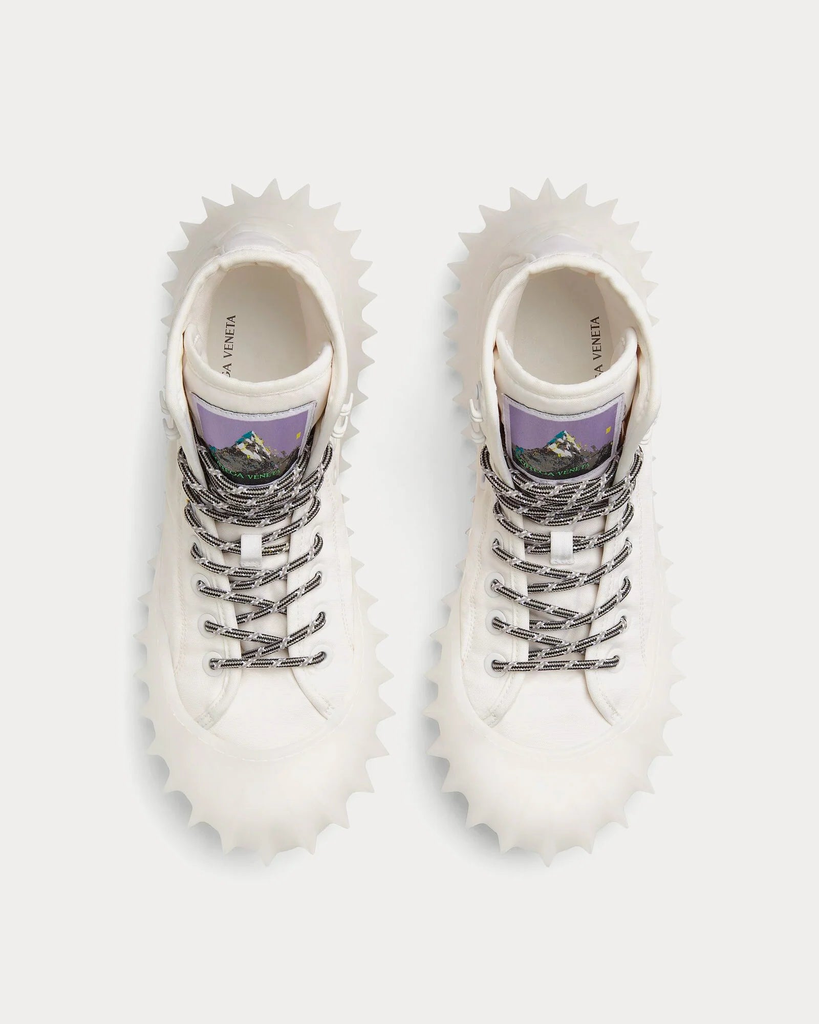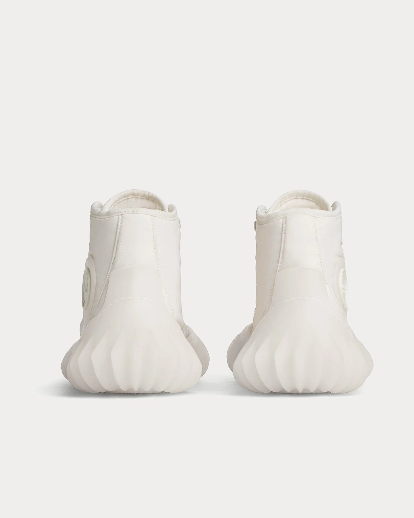 The Bottega Veneta Denver High-Top Sneaker in Optic White blends sleek design with technical craftsmanship. Made in Italy, it features a lightweight nylon upper, a distinctive 3D-textured rubber sole, and subtle signature details like a wax stamp effect and branded tongue label — offering a clean, modern aesthetic with elevated edge.