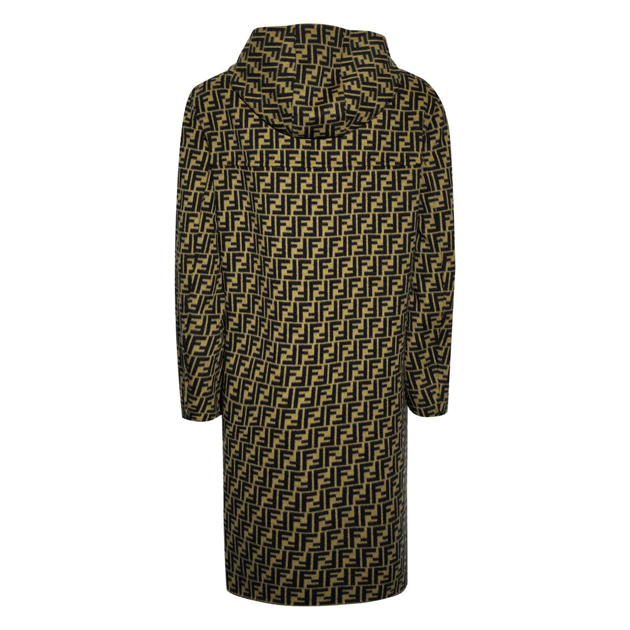 Elegant Fendi hooded reversible wool coat (Model: FF0249A4LJ) crafted from premium virgin wool. This versatile longline coat features a solid color on one side and the signature FF monogram pattern on the reverse, offering two distinct looks. Tailored in Italy with refined leather detailing, this structured outerwear piece offers timeless sophistication and warmth.