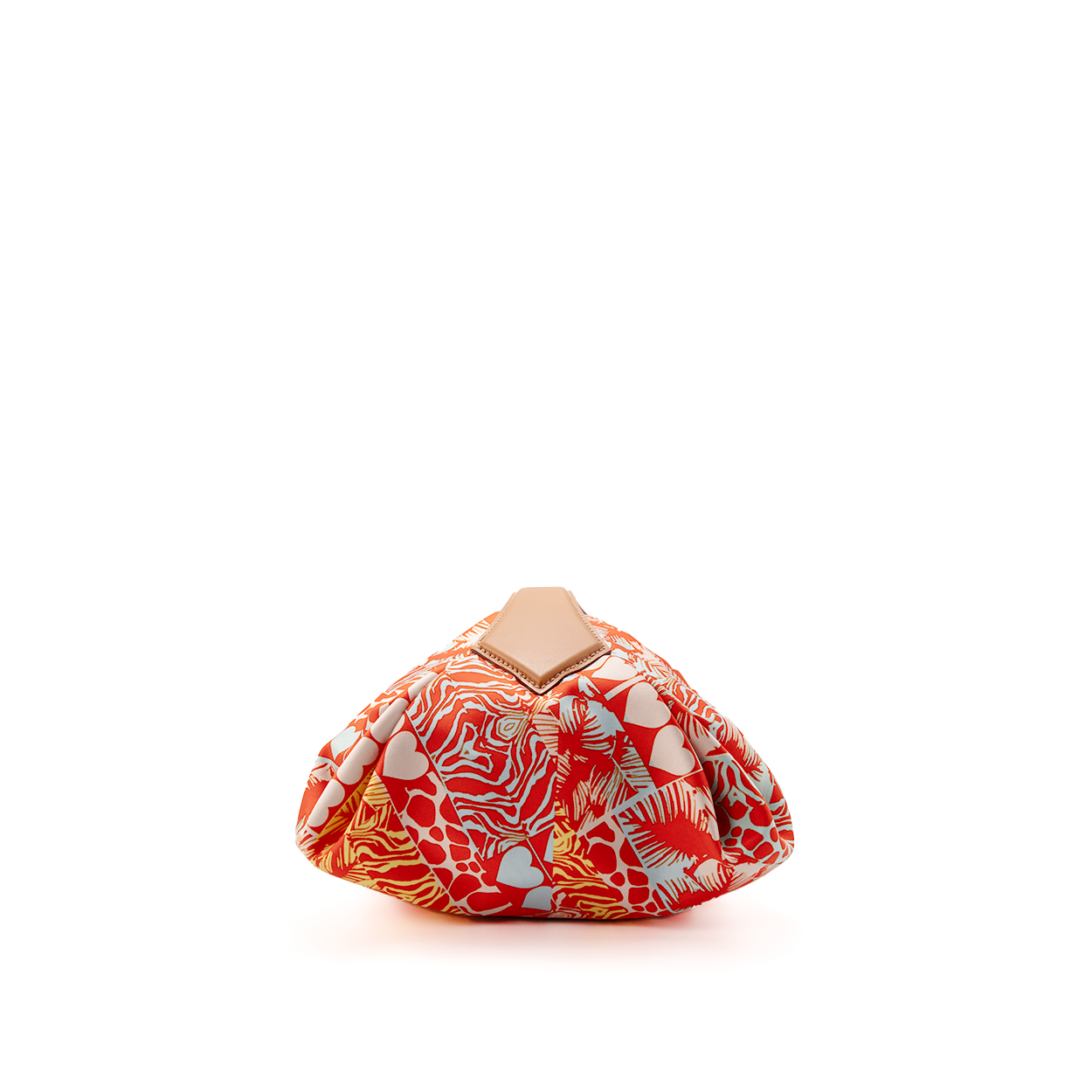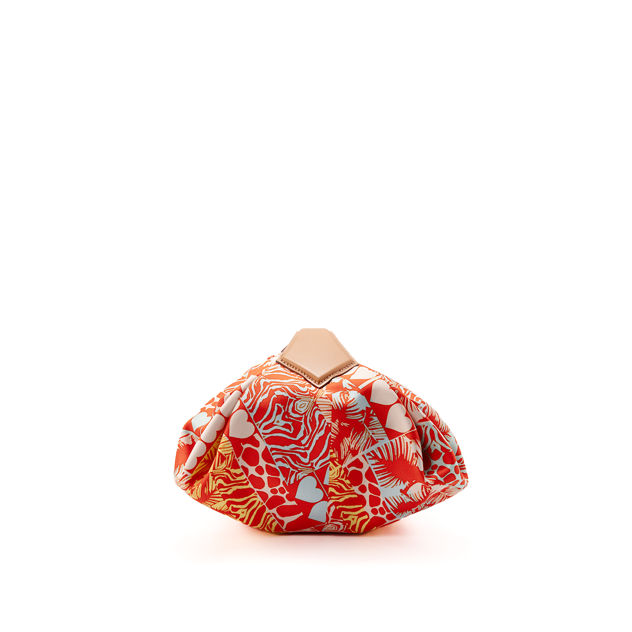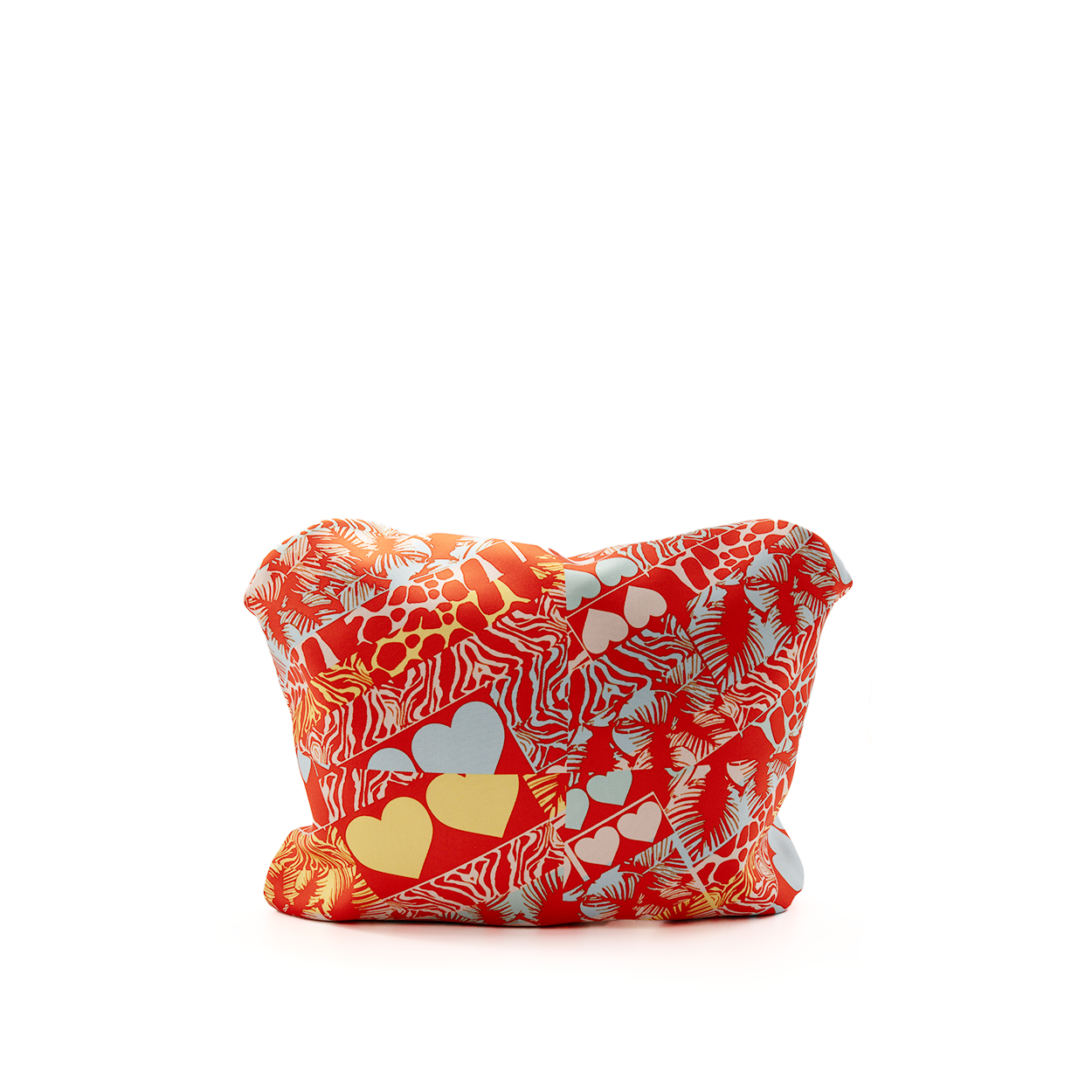 This striking Balusoie bag is crafted from luxurious silk and Hunter cowhide in captivating light blue and red tones. Adorned with the vibrant Wild pattern featuring playful heart graphics, it is accented with light brown leather handles and pull-tabs for a stylish contrast. The unlined, spacious interior is thoughtfully designed to keep all essentials neatly organized.