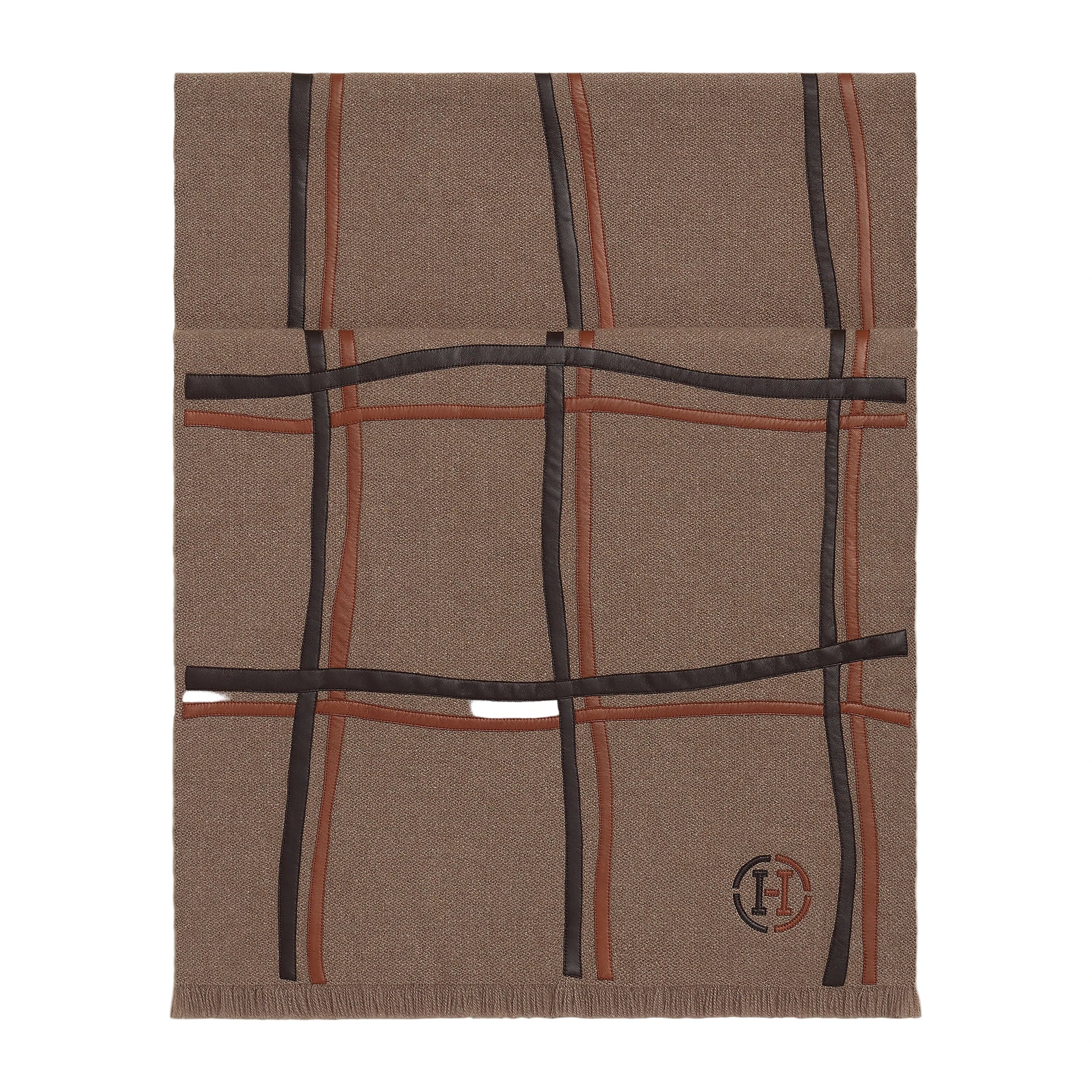 Scarf in cashmere (100% cashmere).This truly exceptional scarf combines traditional craftsmanship and modernity. Hand-cut leather inserts are stitched onto a cashmere base hand-woven in Nepal. The effect is almost hypnotic: the squares seem to undulate as if reflected in water.Made in Nepal.Dimensions: 50 x 190 cm