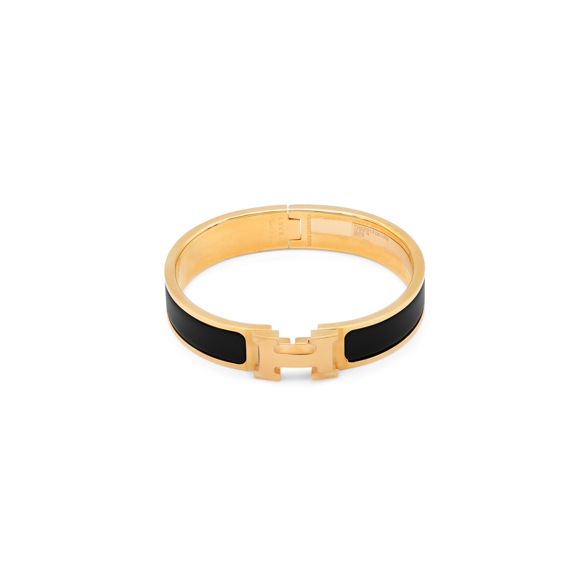 A narrow bracelet crafted from yellow gold-plated metal with a smooth enamel finish. Designed with a clever toggle clasp that subtly reveals the signature "H".