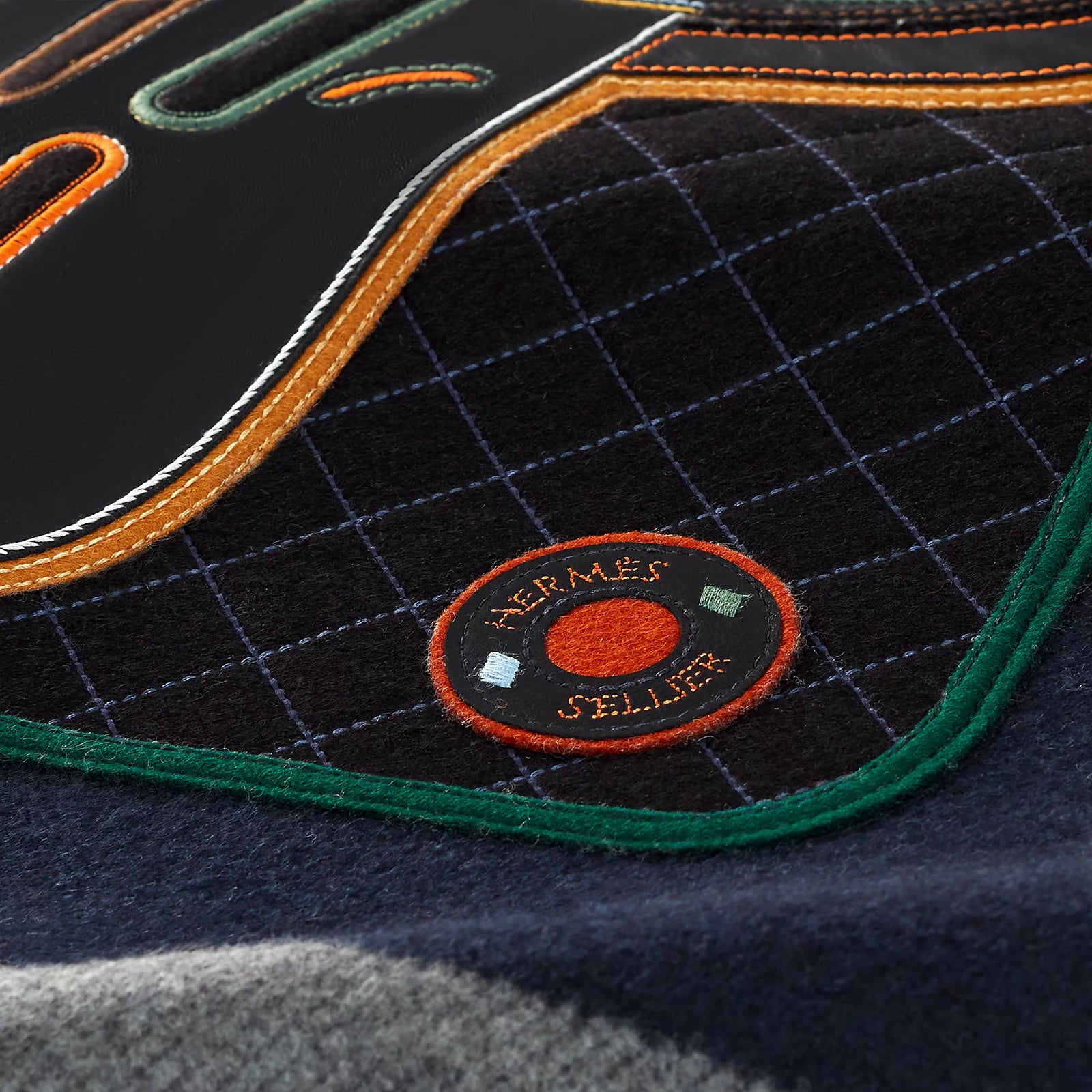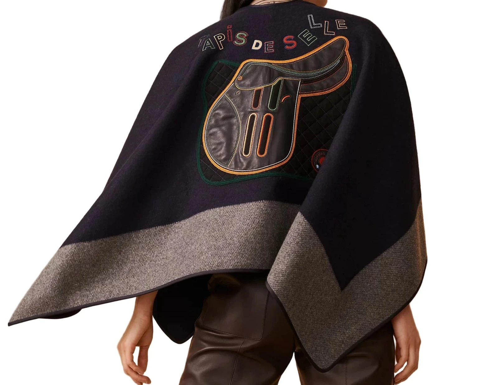 Poncho in cashmere with hand-rolled edges (100% cashmere) . This poncho is in jacquard woven cashmere and embellished with silk twill bias trim carefully sewn around all the edges. The impressive saddle of the Tapis de Selle design is delicately embroidered on the back of the poncho. With its shorter length, this genuine outdoor piece exudes a sporty yet sophisticated look, perfect for any outdoor adventure. Made in Great Britain . Dimensions: 103 x 130 cm