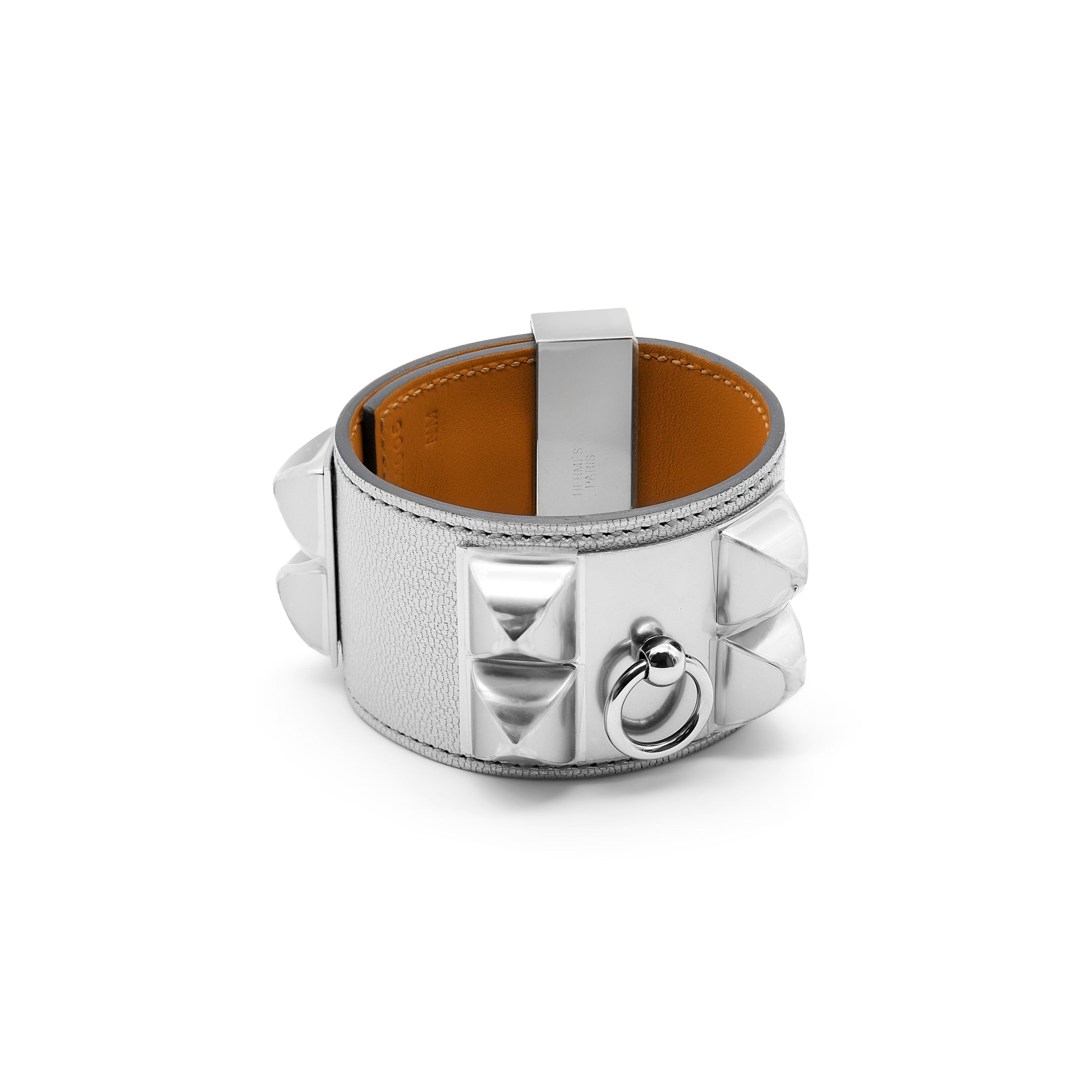 This bold and iconic bracelet in Chamkilight goatskin features an adjustable closure, signature Médor studs, and a central ring. Crafted in France and finished with palladium-plated hardware, it embodies the Maison’s equestrian spirit with refined edge.