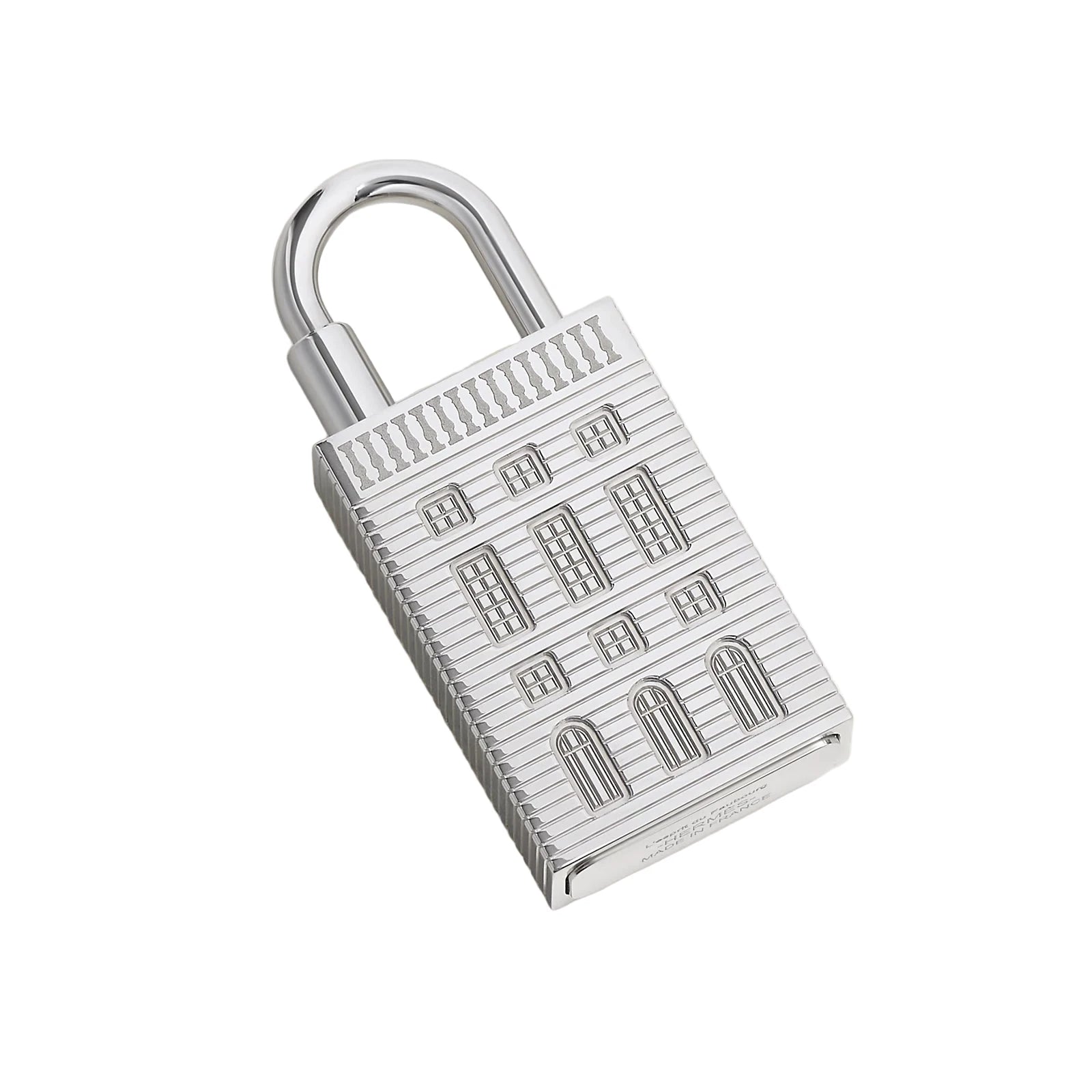 This ingenious key ring in stainless steel, made in France, takes the form of the Faubourg Surprise padlock, inspired by the iconic Parisian store façade and concealing a delightful surprise. Within its design lies a secret drawer that reveals the imaginary objects of Emile Hermès' office, blending creativity with craftsmanship. It measures 5 cm in height and 2.2 cm in width.