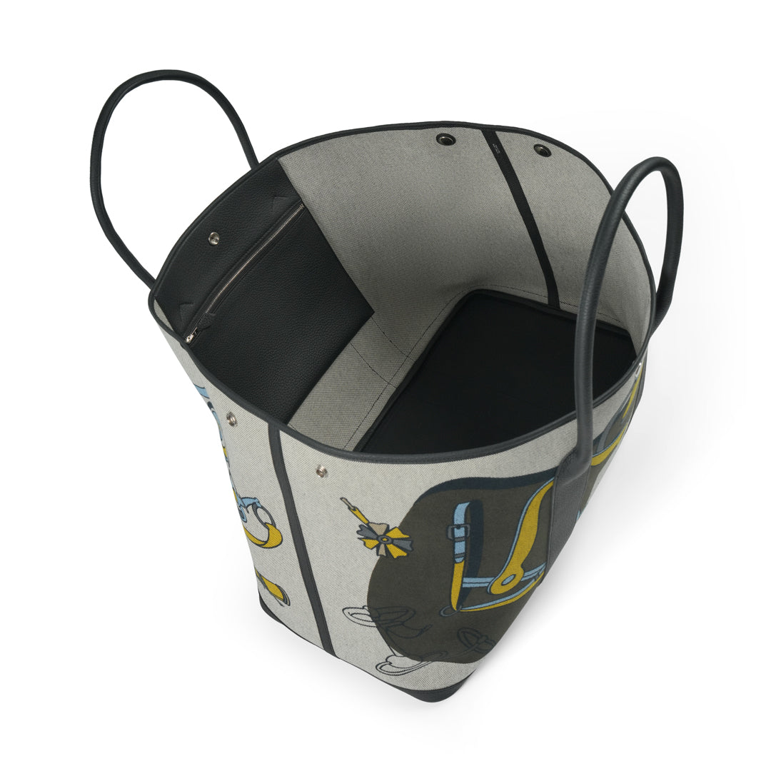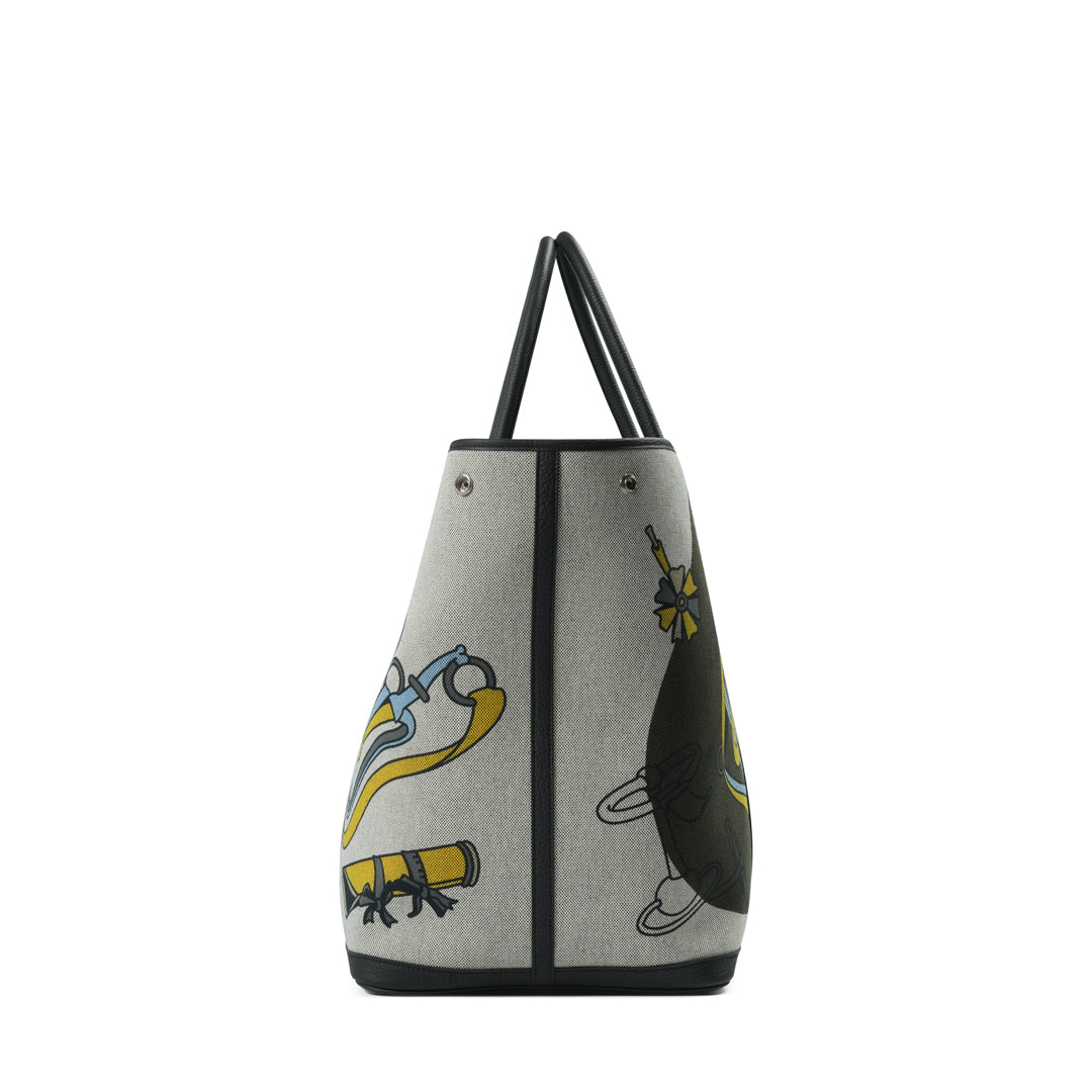 The Garden Party 49 Voyage in Veau Negonda and Toile H Ecru-Noir is a vibrant and elegant travel bag crafted from premium H Plume canvas and Negonda calfskin. Featuring a colorful mix of yellow, beige, light blue, and brown with black handles, it offers a spacious interior with a zipped pocket, while the Clou de Selle snap closure allows for convenient hand carry or attachment to your luggage.