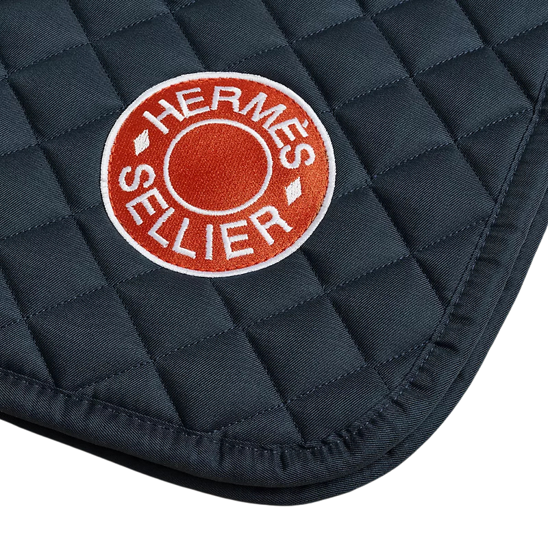 Ergonomically shaped saddle pad featuring lightweight, refined padding for optimal comfort. Designed with a water-resistant outer layer and a breathable honeycomb inner fabric to promote airflow and fast drying. Finished with elegant "Hermès Sellier" Clou de Selle embroidery. Fully machine washable for easy care. Made in Switzerland.