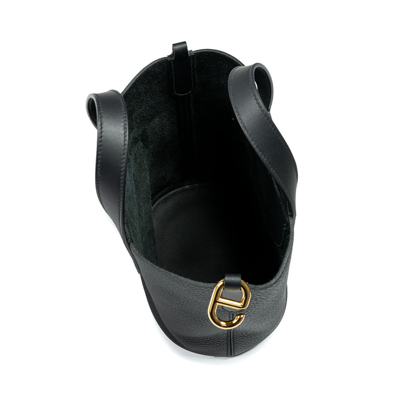 This sophisticated In-The-Loop 18 is crafted from luxurious black Taurillon Clémence and Swift leather. It features two elegant handles inspired by the iconic Anchor Chain motif, mirrored in the bottom and closure for a distinctive touch of refinement. The spacious interior is thoughtfully designed to keep all essentials perfectly organized.- 2024
