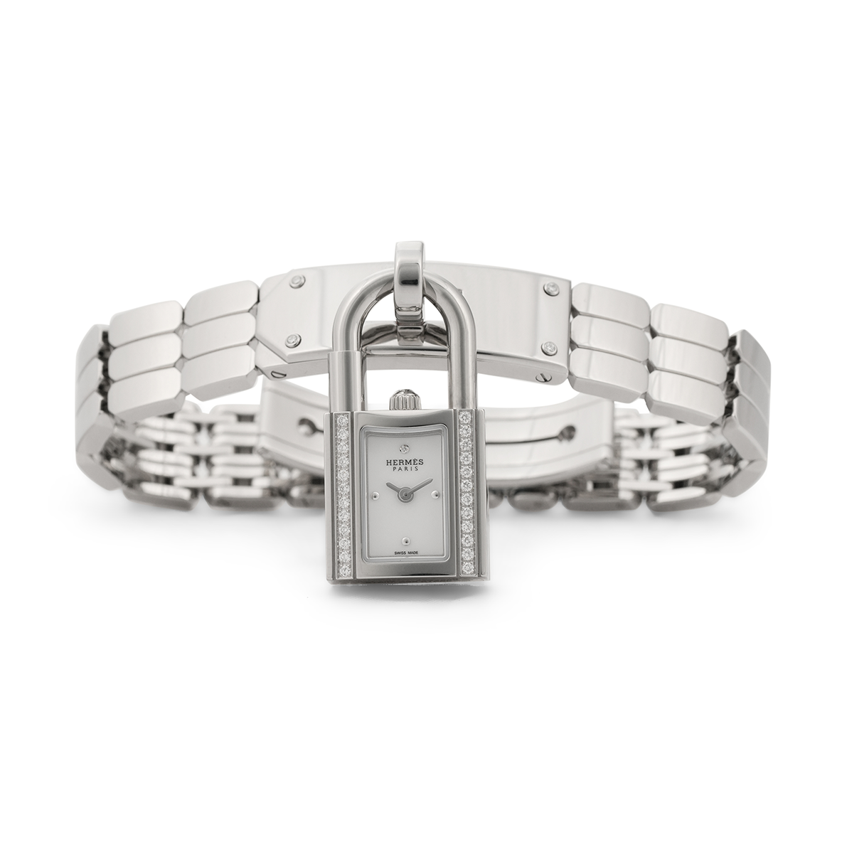 This diamond-set steel watch features a quartz movement, a diamond-set spangled white-lacquered dial, a detachable padlock, and a lanyard in black Barenia calfskin. It is complemented by a steel bracelet and a diamond-set steel plate. Made in Switzerland with a polished steel finish.