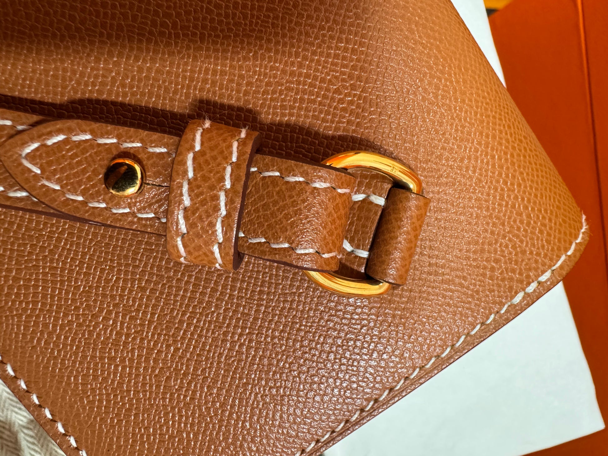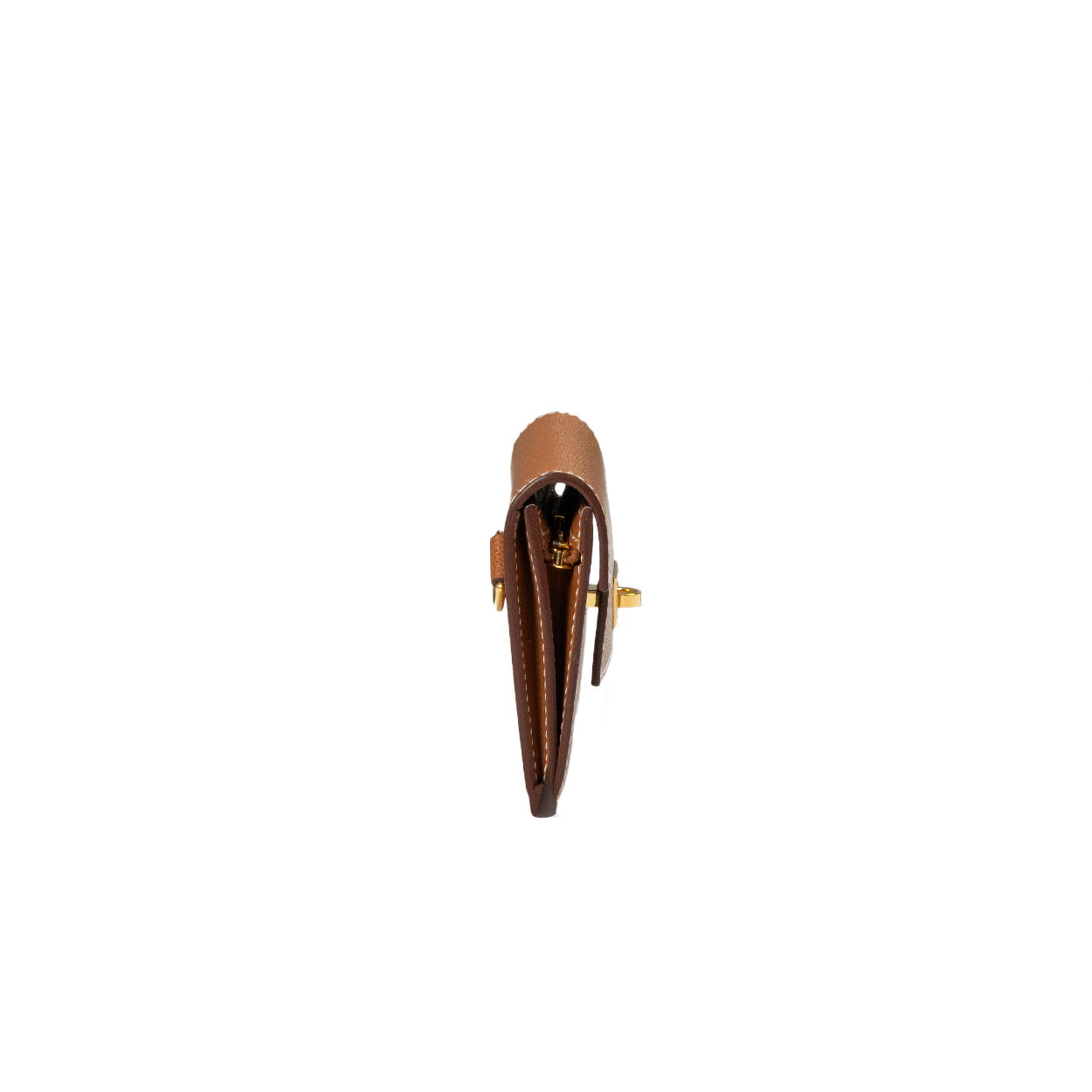 Kelly Pocket Slim Wallet Gold Epsom. Crafted from light brown Epsom leather, this slim wallet features a palladium toggle, zip-secured interior, and a detachable strap for versatile wear.